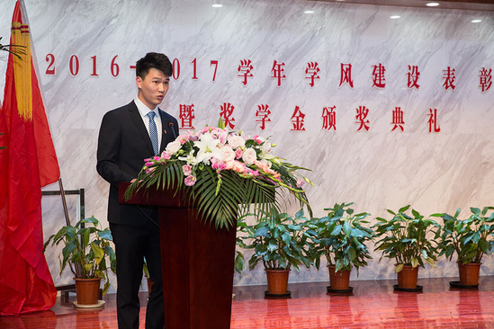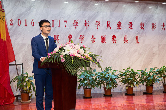 随后,学校及各院系领导为各奖项获奖代表颁发荣誉证书。国家奖学金获得者英语语言文化学院英语1601班李源涛和校外竞赛奖获得者文法系法律班1601班孙怡平作为获奖代表发言。