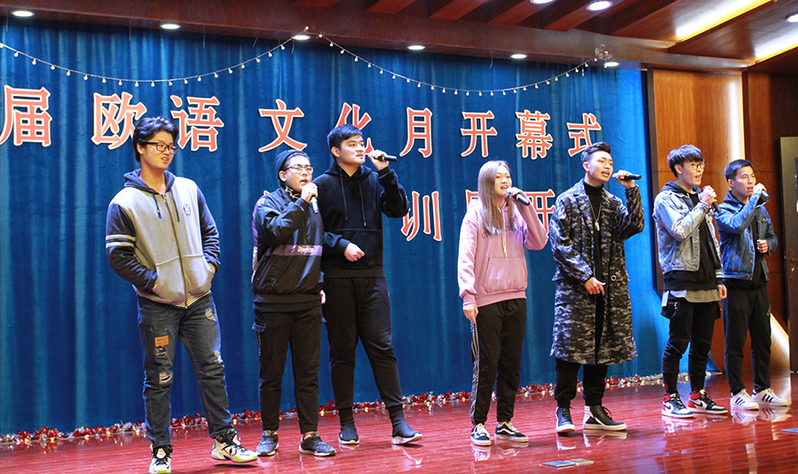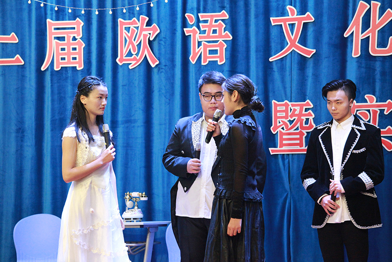随后,俄语系、法语系学生相继带来了合唱《МойЗайчик/我的宝贝》和诗歌朗诵《Rencontrer la poésie/遇见诗歌》,轻柔的音乐和浪漫的诗歌,营造了优雅的意境,使在场师生得到了舒美的视听享受。Immer社则带来了德语话剧《Rebecca》(节选),新颖独特的表演,展示了德国经典话剧的魅力。随后,俄西法德四系的语言串烧联唱,展现了欧洲语言文化特色,赢得了在场观众的热烈掌声,将开幕式推向了高潮。