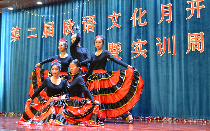西班牙语系学生带来的弗拉明戈特色舞蹈拉开了活动序幕。虞龙发院长对欧语文化月的开幕表示了祝贺,他指出,欧语文化月活动是学院的品牌文化活动,也是课堂外语教学、学生实训实践的延伸,更是丰富校园文化的重要渠道。