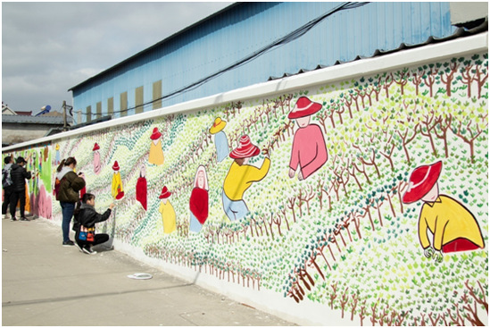 3月7日上午,108名学生在7名专业课老师带领下,对惠南镇六灶湾村6个定点的700平方米墙面进行了大型墙绘创作。