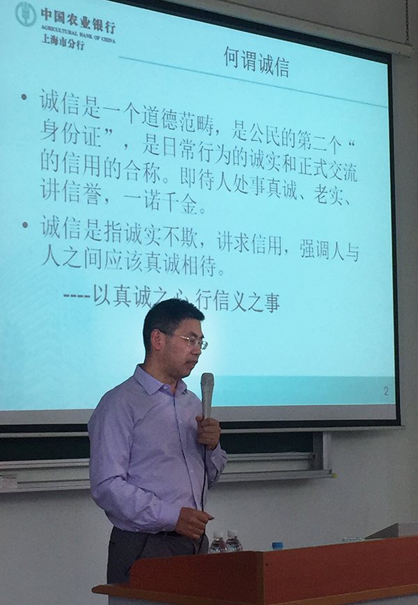 5月18日下午,学生处邀请农业银行上海南汇城南支行王荣云经理来校开展“做一名诚实守信的公民”主题讲座。参加此次讲座的有学生处副处长陈瑜老师、学生处严丹芬老师及申请助学贷款的在校学生。