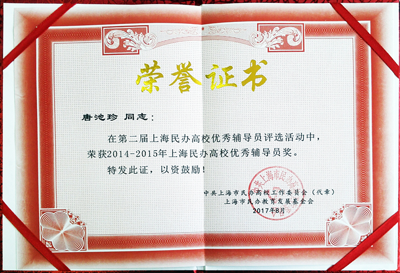 近日,评选表彰活动落下帷幕,我校唐池珍老师被授予“2014-2015年度上海民办高校优秀辅导员”称号。展示了我校辅导员的精神风貌和优秀素养,体现了我校辅导员队伍建设取得的成效。