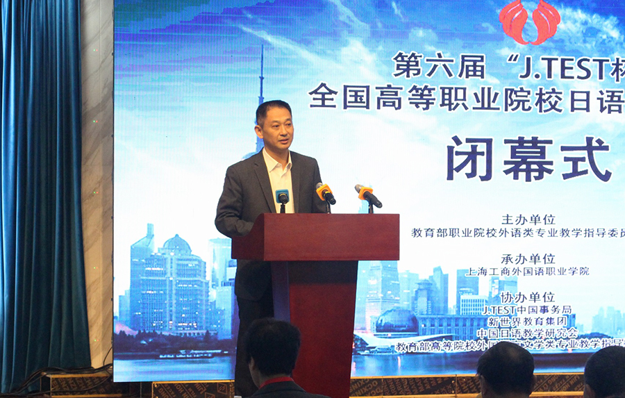 29日,教育部职业院校外语类专业教学指导委员会日语专业委员会邵红教授主持大赛闭幕式。出席闭幕式的领导和专家有教育部职业院校外语类专业教学指导委员会副主任委员、王志教授,我校党委副书记、副校长段仁启,原教育部职业院校外语类教学指导委员会副主任委员、原宁波职业技术学院副院长张学库教授,原教育部高等学校外国语言文学类专业教学指导委员会日语分委会主任、上海外国语大学副校长、博士生导师谭晶华教授,中国日语教学研究会名誉会长、原教育部高等学校外国语言文学类专业教学指导委员会日语分委会副主任、原吉林大学外国语学院院长、博士生导师宿久高教授,上海外国语大学博士生导师皮细庚教授,同济大学博士生导师吴侃教授,教育部职业院校外语类专业教学指导委员会日语专门委员会主任、中国日语教学研究会副会长、天津外国语大学研究生院院长李运博教授,早稻田大学教师教育研究所研究员王智新教授,日本中国友好协会东京都联合会常任理事渡边定子老师,道都大学国際交流センター長 岡島徳あき,J.TEST中国事务局总裁董唯诚先生,J.TEST日本事務局社長秋田ともるさん,大连理工大学出版社外语教材出版中心主任庄晓红,外语教学与研究出版社、综合语种分社编委会主任薛豹先生,外语教学与研究出版社、日语编辑室主任杜红坡先生等。