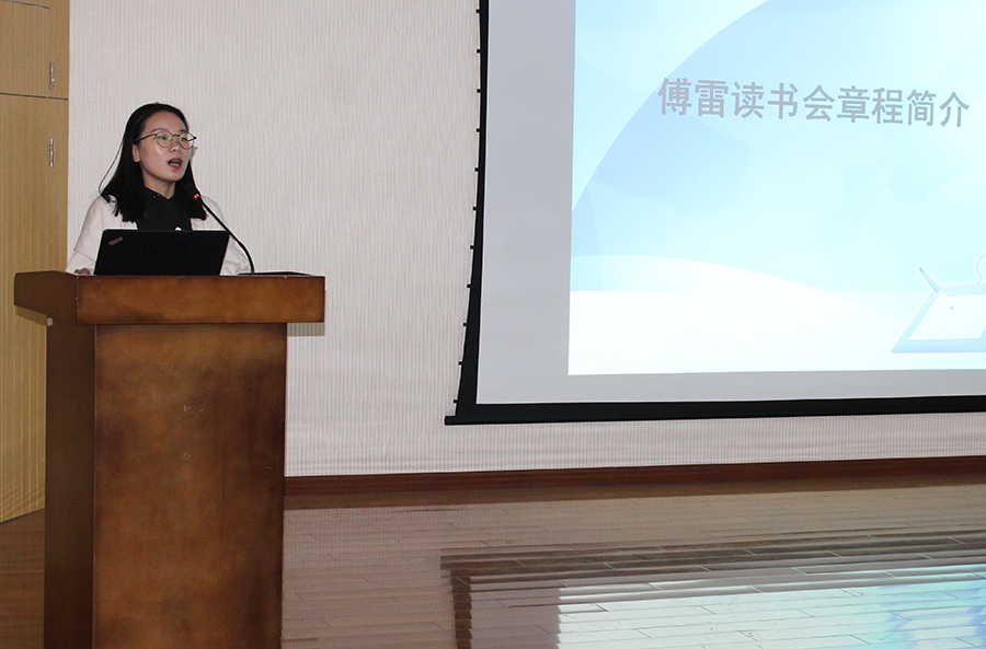 之后移师在一楼报告厅举行的“傅雷读书会会员大会”,首先由读书会会长英语1603班同学程温情从社团性质、社团宗旨和社团组织结构三个方面,对《傅雷读书会章程》进行了解读,并呼吁广大会员办好傅雷读书会的各项活动。