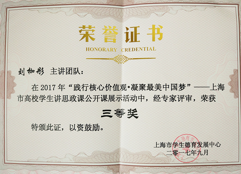 我校学生参加了其中的“赤子初心”——全国高校思想政治理论课学生艺术作品巡展以及“践行核心价值观•凝聚最美中国梦”——全国高校学生讲思政课公开课展示活动。最终,来自德语1604班的刘枷彤同学主讲团队在上海市高校学生讲思政课公开课展示活动中荣获三等奖,指导教师为张连梅老师。