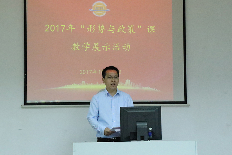在迎接党的十九大胜利召开之际,为深入贯彻落实全国和上海高校思想政治工作会议精神,认真落实教育部和上海高校思政课教学质量年专项工作,有效深化“形势与政策”课教学改革,进一步加强上海高校形势与政策教育教学,根据中共上海市教育卫生工作委员会、上海市教育委员会《关于举办2017年上海高校“形势与政策”课教学展示活动的通知》要求,我校于10月12日上午在四号楼心理活动团训室举办了2017年“形势与政策”课教学展示活动。担任展示活动的五位评委是校党委副书记、副校长段仁启,思政教学部兼学工部部长沈李,思政教学部党支部书记姚惠福,督导室主任花克勤以及教务处副处长张磊。思政教学部副主任曹鑫海主持教学展示活动。
