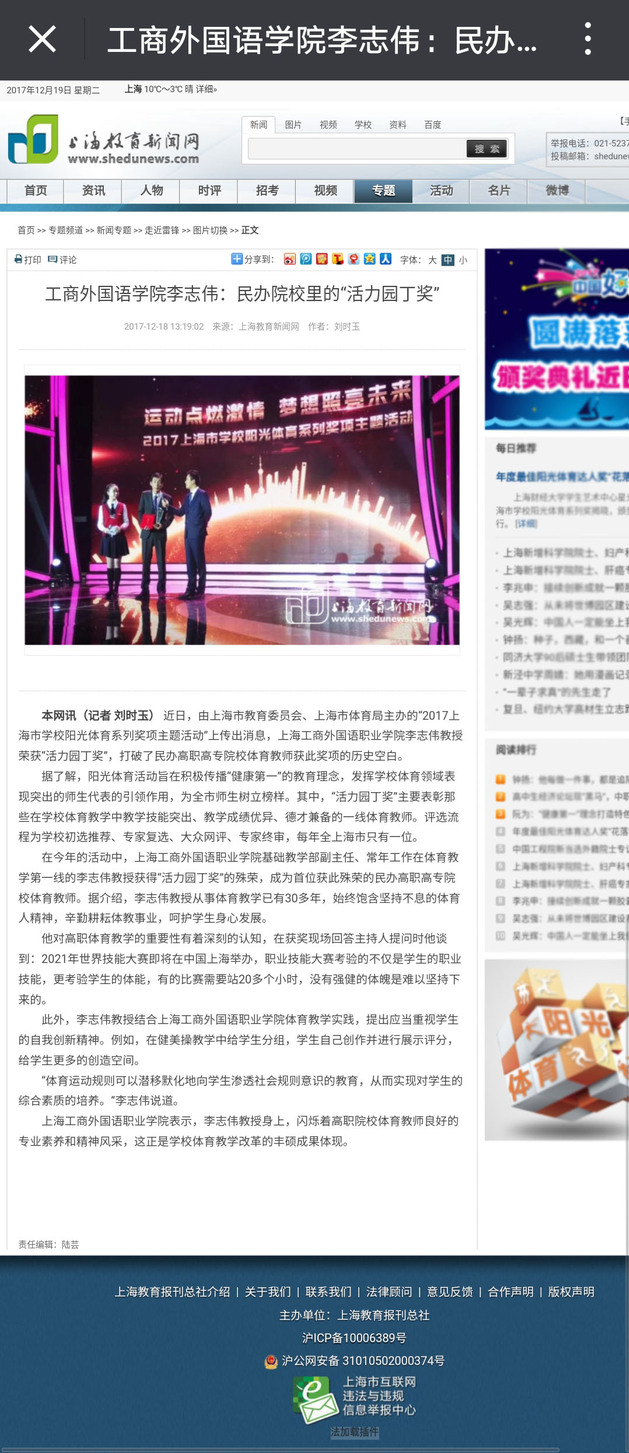 上海教育新闻网(记者 刘时玉) 近日,由上海市教育委员会、上海市体育局主办的“2017上海市学校阳光体育系列奖项主题活动”上传出消息,上海工商外国语职业学院李志伟教授荣获“活力园丁奖”,打破了民办高职高专院校体育教师获此奖项的历史空白。