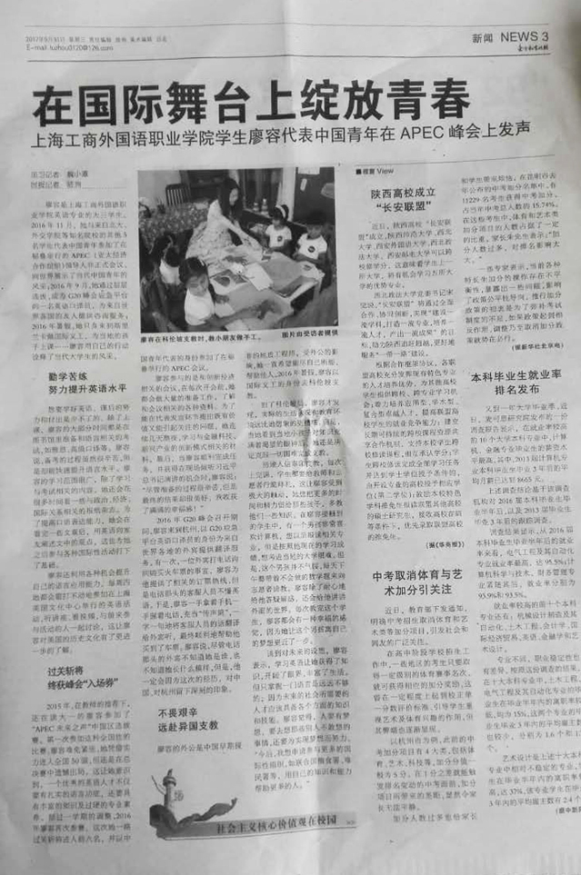 廖容是上海工商外国语职业学院英语专业的大三学生。2016年11月,她与来自北大、外交学院等知名院校的其他5名学生代表中国青年参加了在秘鲁举行的APEC(亚太经济合作组织)领导人非正式会议,向世界展示了当代中国青年的风采;2016年9月,她通过层层选拔,成为G20峰会应急平台的一名英语口译员,为来自世界各国的友人提供咨询服务;2016年暑假,她只身来到斯里兰卡做国际义工,为当地的孩子上课……廖容用自己的行动诠释了当代大学生的风采。