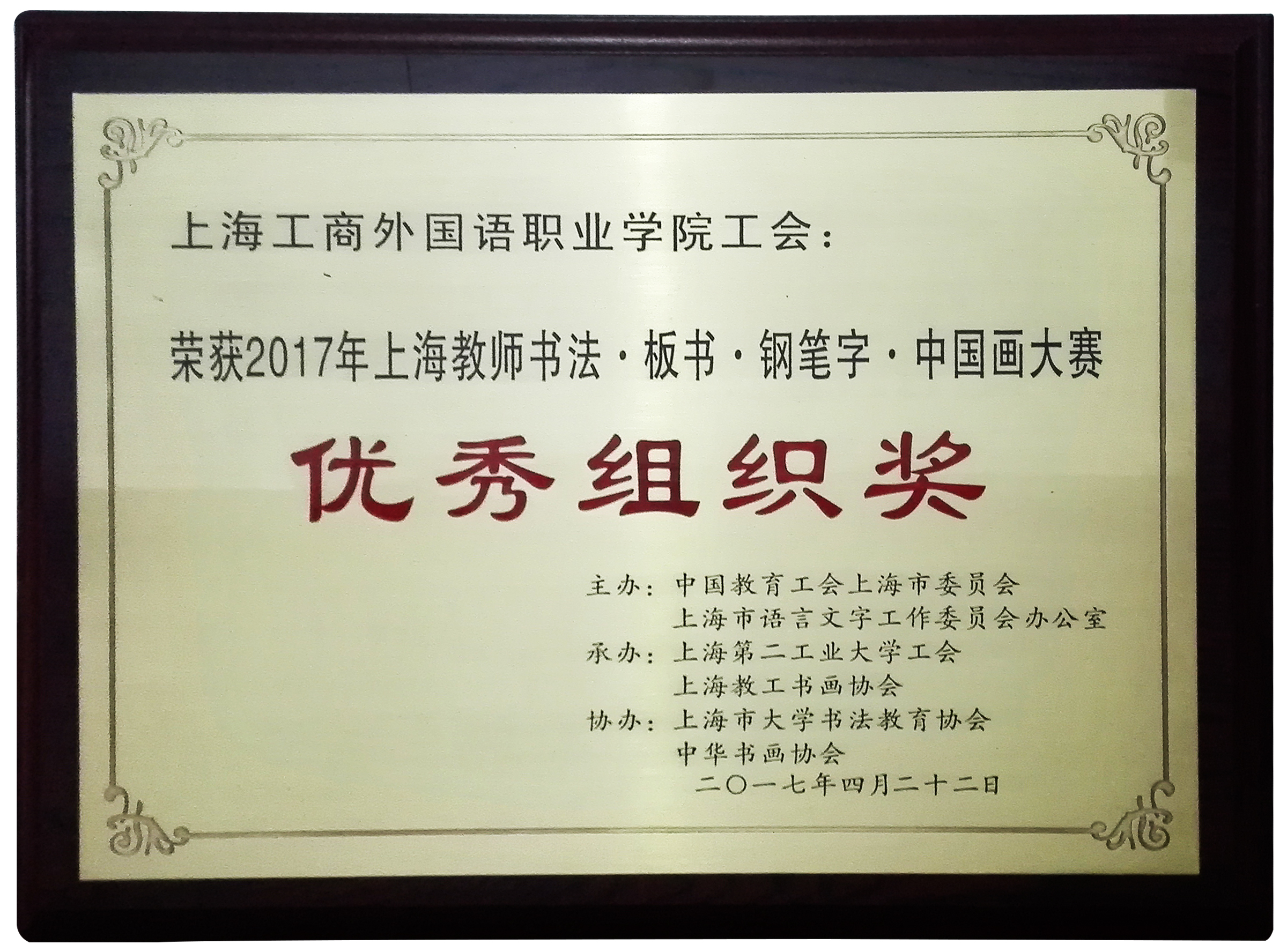 为了提高广大教师教学素养,加强教学基本功训练,搭建广大教师学习交流平台。4月22日,上海市教育工会在上海第二工业大学隆重举办了2017年上海教师书法·板书·钢笔字·中国画大赛。我校工会积极组织选派教师参加钢笔字比赛,其中文法系马文婷老师再次获奖,荣获钢笔字高校青年组二等奖的佳绩,展示了工商外教师良好的精神风貌,为学校赢得了荣誉。校工会同时获得优秀组织奖。