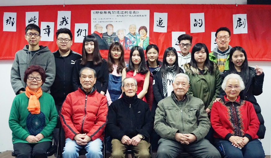 图:五位粤剧届老前辈与欧语学院部分沪语社社员合影
