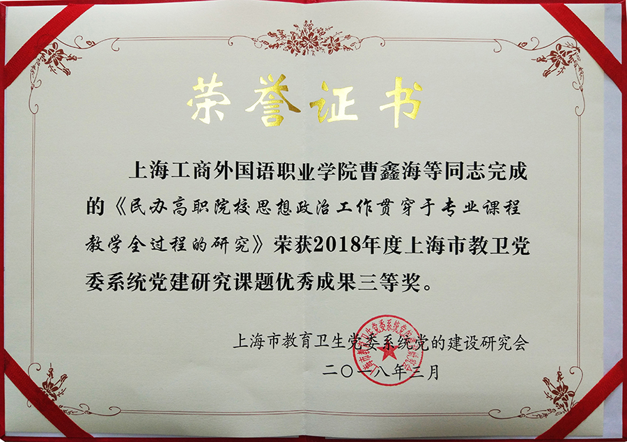 会议表彰了2017年度市教卫党委系统党建研究会优秀成果。我校党建研究会申报的由曹鑫海等老师完成的《民办高职院校思想政治工作贯穿于专业课程教学全过程的研究》作为重点立项课题荣获上海市教卫党委系统党建研究课题优秀成果三等奖,这也是民办高校中唯一获奖课题。董琰老师的《健全和规范基层党支部“三会一课”制度研究》和王欢老师的《微信在高职院校学生党建工作中的应用研究》作为自选课题顺利结题。
