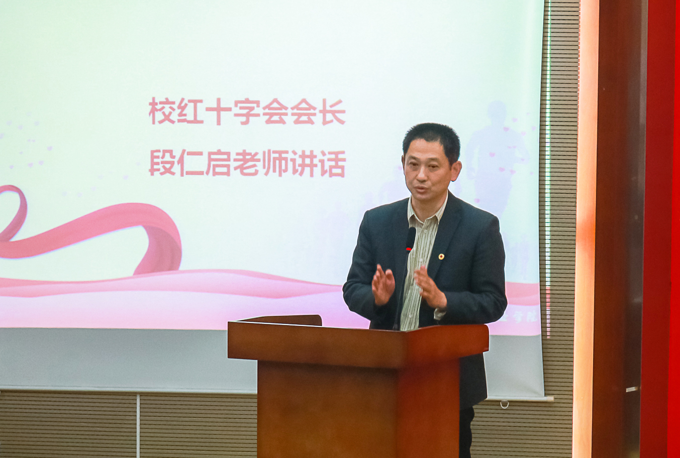 校红十字会会长段仁启老师最后讲话。他对在座同学简要回顾了红十字的历史,诠释了红十字“人道、博爱、奉献”的精神理念。在祝贺校红十字会学生分会干部换届的同时,他表示,作为新一届校红十字会会长,将全力支持我校红十字工作开展,并希望全校师生能把红十字精神内化于心、外化于行。