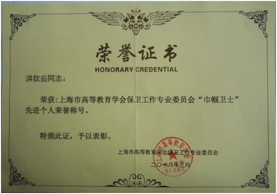 近日,上海市高等教育学会保卫工作专业委员会公布了2016-2017年度“巾帼卫士” 先进个人名单,我校后保处洪钦茹和其他高校的19名老师同获此殊荣。