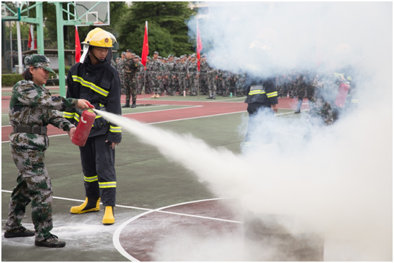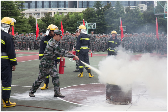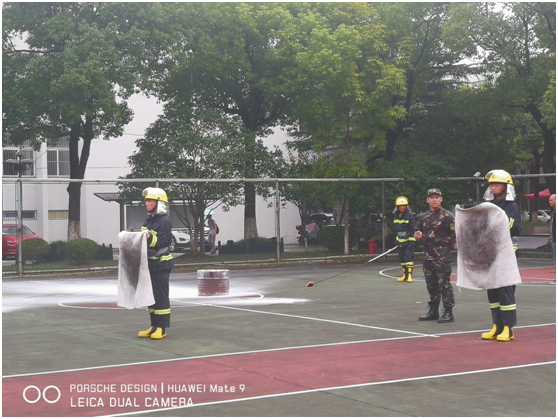 接着在体育场进行灭火器材的演练。首先由我校微型消防站的义务消防员大学生平安志愿者,对如何使用干粉灭火器、灭火毯等基本消防安全知识讲解示范。强调注意事项并进行演示后,参演学生随后使用干粉灭火器及灭火毯进行实际灭火演练。