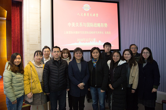 12月12日下午,上海国际问题研究院副研究员吴莼思受邀做客我校“人文素质大讲堂”,在学校四号楼四百人报告厅为师生代表做了一场题为“中美关系与国际战略形势”的报告。思政教学部主任沈李、副主任曹鑫海及形势与政策教研室任课老师到场聆听,讲座由沈李主持。