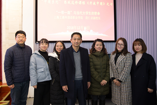 12月13日晚,我校党委副书记、副校长段仁启在四号楼四楼报告厅为我校大一学生代表讲授了“中国系列”思政选修课程《开放中国》第七课:《“一带一路”与当代大学生的使命》。形势与政策教研室部分教师到场聆听。讲座由形势与政策教研室主任冉蓉主持。