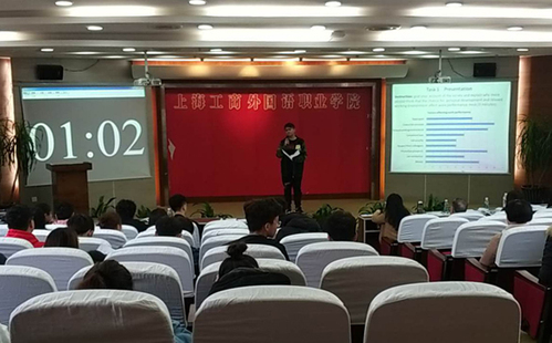 比赛分两轮,第一轮包括“职场描述和情景问答”。“职场描述”环节,选手在3分钟内概括图表内容,并挖掘出隐含的信息、提出自己的观点。“情景问答”环节,提问官就一则广告中的细节信息进行提问,选手作答。这两个题型对参赛者的英语语言运用能力、职场知识储备以及逻辑分析能力等提出很高的要求,也考察了新时代背景下高职院校学生在职场环境中的英语综合应用能力。选手们认真准备、沉着应战,他们规范流利的语言表达,清晰鲜明的观点阐述,赢得在座同学们的阵阵掌声。
