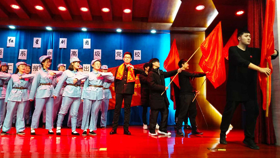 第三幕,弘扬革命先辈红色精神。40余名中级党校学员以电影《闪闪的红星》中三首电影插曲《红星闪闪》《映山红》《红星找我去战斗》》为主题的歌舞剧为大家传颂红军精神,再现红色经典。