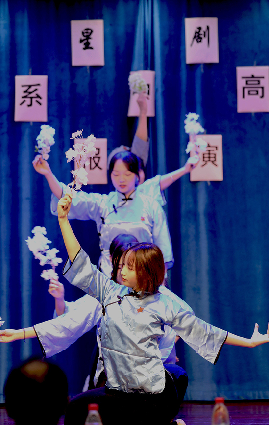 演出分五幕,第一幕,讴歌改革开放40周年。日语系高级党校学员挥舞着手中的旗帜,热情歌颂了新中国成立69年来所取得的伟大成就。
