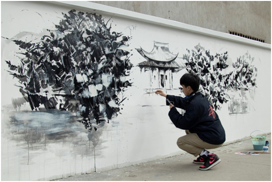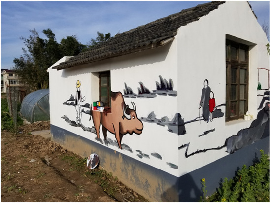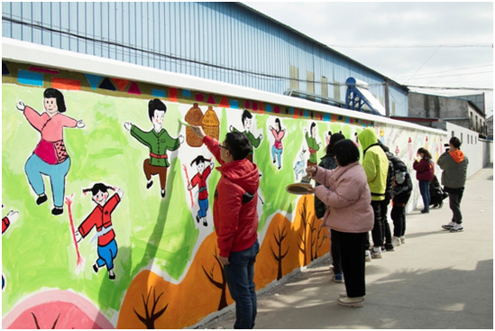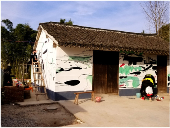 3月7日上午,108名学生在7名专业课老师带领下,对惠南镇六灶湾村6个定点的700平方米墙面进行了大型墙绘创作。