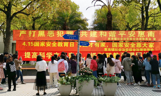 4月17日,在第四个全民国家安全教育日到来之际,我校和惠南镇社会治安综合治理委员会联合主办的宣传活动在中校区小广场举行。