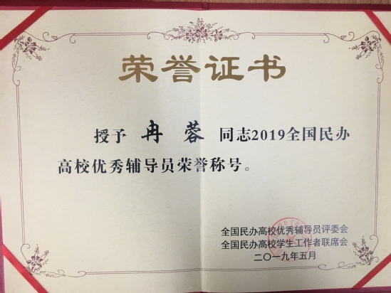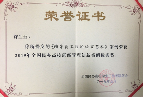 全国民办高校优秀辅导员颁奖典礼在论坛期间隆重举行,155位来自基层的全国民办高校辅导员代表荣获“优秀辅导员”殊荣,我校英语语言文化学院辅导员冉蓉老师榜上有名。新媒体与文法学院辅导员许兰玉老师以《辅导员工作的语言艺术》荣获2019年全国民办高校班级管理创新案例优秀奖。