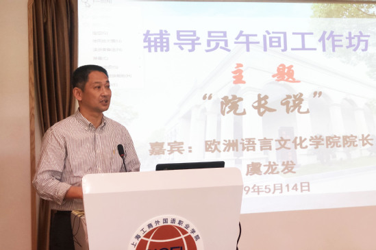 5月14日中午,由学生处主办的第九期辅导员“午间工作坊”之“院长说”(第四期)活动在大学生活动中心辅导员工作坊举行,此次活动邀请欧洲语言文化学院院长虞龙发教授作为主讲嘉宾。校党委副书记、副校长段仁启,学生处处长陈瑜,各二级学院学生工作负责人及全体辅导员出席了此次活动,活动由陈瑜主持。