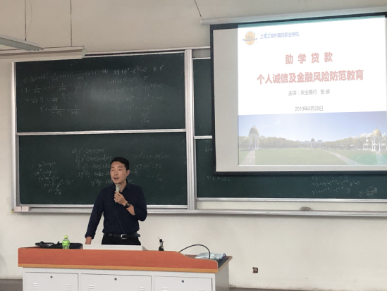 5月29日下午,学生处邀请农业银行上海南汇城南支行张峰老师来我校开展“诚信借款、按时还款、远离非法贷款”的主题讲座。参加此次讲座的有学生处副处长黄慧华老师、学生处严丹芬老师及申请助学贷款的在校学生。