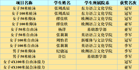 11月16日,2019年上海市大学生游泳锦标赛在同济大学(嘉定校区)游泳馆举行,此次比赛共有全市23所高校共计427名运动员参赛,我校共派出9名游泳运动员(5女4男)应赛。经过激烈角逐,我校代表队最终取得了单项4金2银4铜,接力1金1银及女子团体总分第二、团体总分第四的优异成绩。