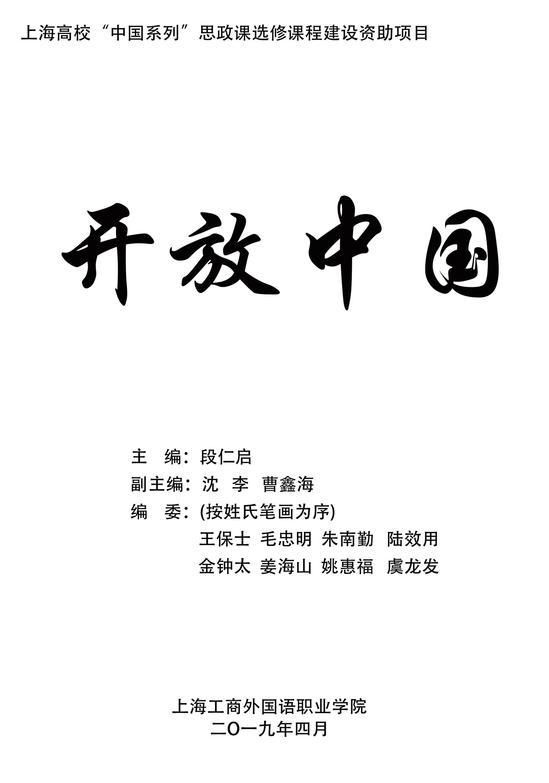 为了更好地让大学生学习《开放中国》课程,我们在上海教委资助项目的大力支持下编写了教材。在编写过程中,得到了许多专家及同行的关心与支持,并借鉴和参考了最新的相关成果,在此,我们表示衷心感谢。由于编者水平有限,难免有疏漏之处,恳请大家批评指正,以便日臻完善。