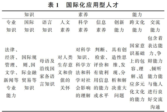 “一带一路”沿线各国大多是新兴经济体和发展中国家,普遍处于经济发展的上升期,资源禀赋各异,经济互补性较强,彼此合作潜力和空间很大。在“一带一路”背景下,新的项目将产生新的人才需求,不同的项目领域,相应地需要各类应用型人才。在2016年11月21日第三届世界互联网大会上发布的《“一带一路”人才白皮书》中,业界首次利用“跨区域人才大数据”解读中国企业“一带一路”人才布局的研究报告。深入分析了30多个“一带一路”沿线重点国家和地区的人力资本现状,综合评估了高品质人才供给、中国企业海外市场竞争力、跨文化管理等多个维度,全方位解析“一带一路”倡议下对人才素养的基本需求。经过分析,认为“一带一路”倡议下,对国际化应用型人才素养和类型的主要需求在以下方面,见下表。