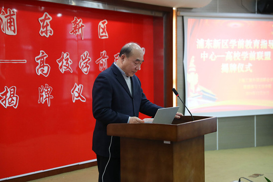 12月31日上午,浦东新区“中心——高校学前联盟”揭牌仪式在我校八号楼报告厅举行。浦东新区学前教育指导中心主任诸君、副主任竺清、俞晓菊老师及我校常务副校长毛忠明,党委书记李月松,党委副书记、副校长段仁启,教务处处长张磊,招生就业处处长武桂玲,新媒体与文法学院教学院长陈小明、新媒体与文法学院副院长张虹、新媒体与文法学院党支部书记、行政副院长唐池珍出席仪式,学前教育专业近百名师生参加此次活动。