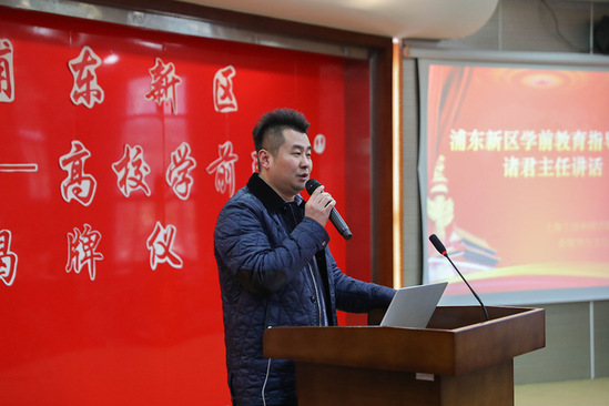 之后,浦东新区学前教育指导中心诸君主任讲话。幼儿教师的职前实践学习至关重要,诸主任介绍了联盟成立的三个初衷,表示希望通过“中心-高校联盟”的方式,培养优质学前人才,挽留专业人才,为浦东学前教育注入更多新鲜力量。