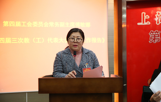 首先,第四届工会委员会常务副主席傅敏娜作《第四届三次教(工)代表大会筹备工作报告》。由第四届工会委员会副主席于丽艳作《第四届三次教(工)代表大会代表资格审查报告》。