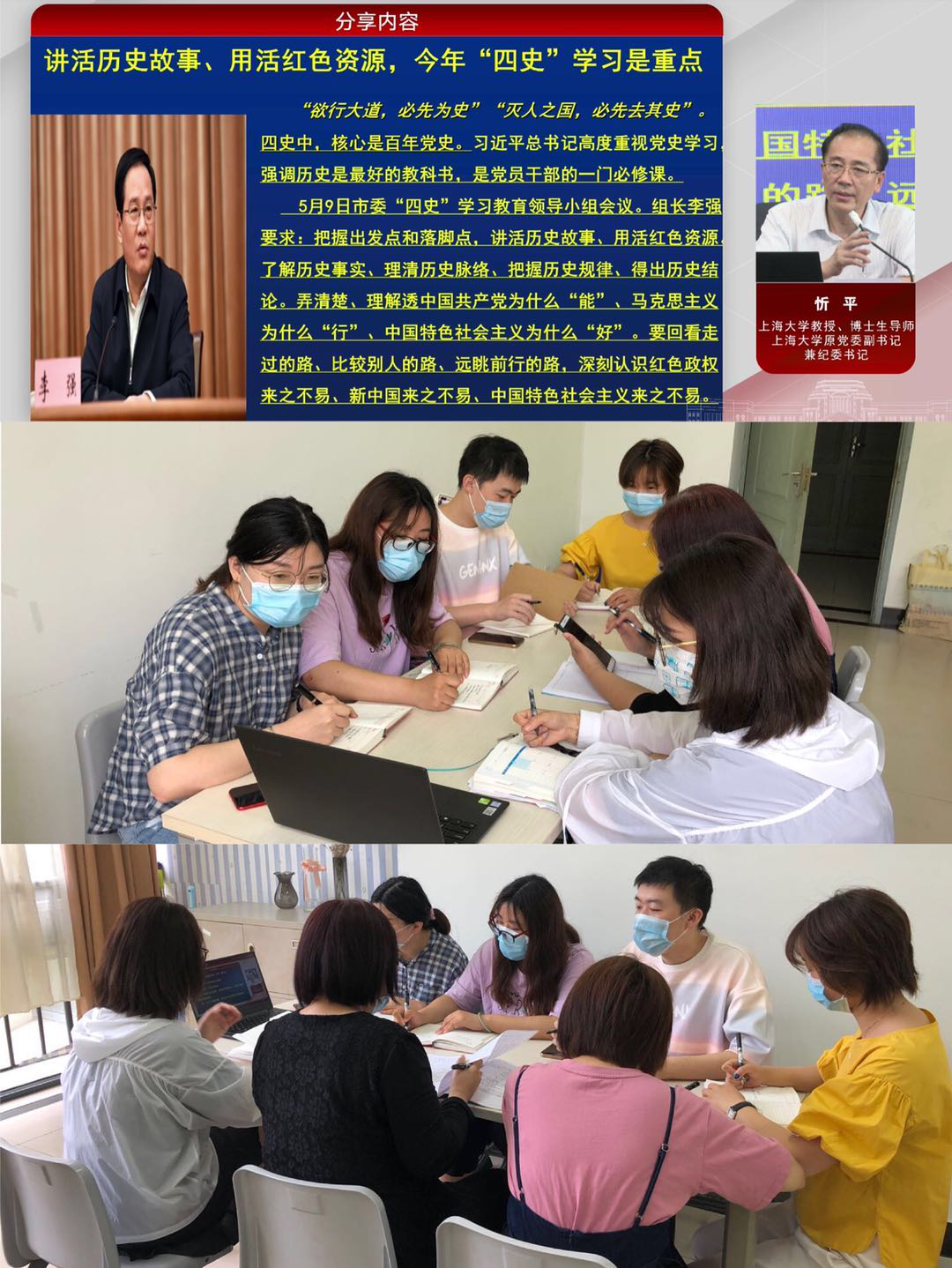 忻平教授通过介绍上海市委的会议精神、国庆七十周年大典的仪式感,向我们辅导员老师们传达了学习“四史”的重要性。在这次抗击疫情事件中,我们可以看到当今“中国之治”与“世界之乱”形成鲜明对比,由此我们可以看到借鉴历史经验,可以帮助我们自己、我们的国家更好的应对世界“百年未有之大变局”。忻教授用中共一大会议的三大迷团新颖生动的讲述了中共一大这一段奠定我党基础的历史,不仅令人印象深刻,同时启示老师们讲述政治历史课程可以用故事来充实丰满,将我们的党史精神更好的传递给学生们。(智能制造与信息工程学院胡颖)