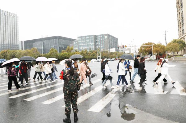 平安志愿者支队队员统一着装、精神饱满,分别在人民东路、拱极路以及东门卫站岗执勤,同时,各个十字路口也设岗位,不时地对经过的师生们进行友情提醒,雨天路滑,避免拥挤,注意来往车辆等。